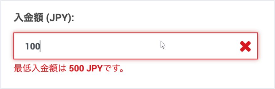 500円以下の入金額を打ち込むと上記の画像のように注意されます。