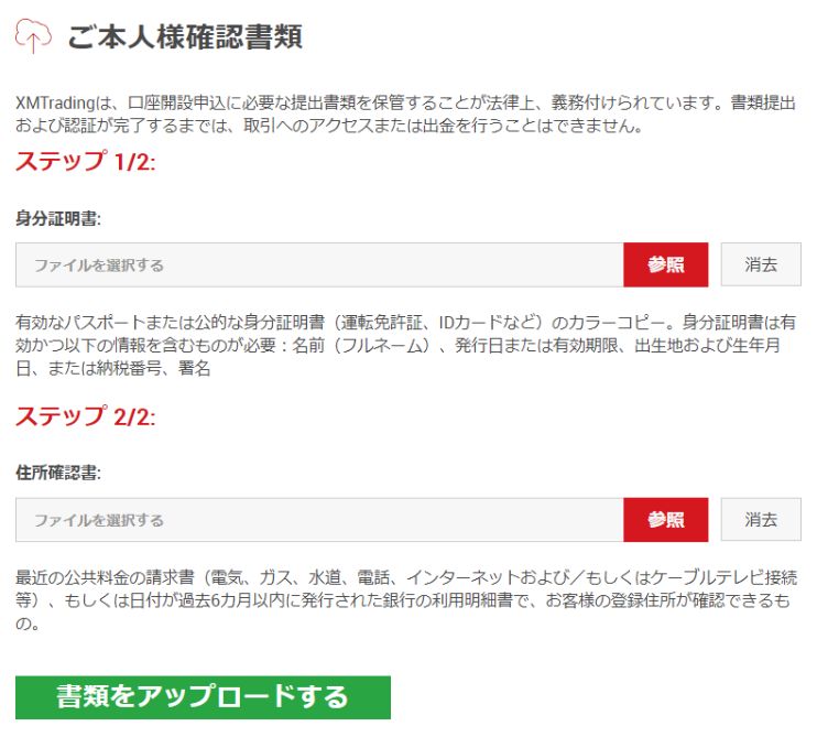 更に進めていきますと、身分証明書類と住所確認書類の提出が求められます。