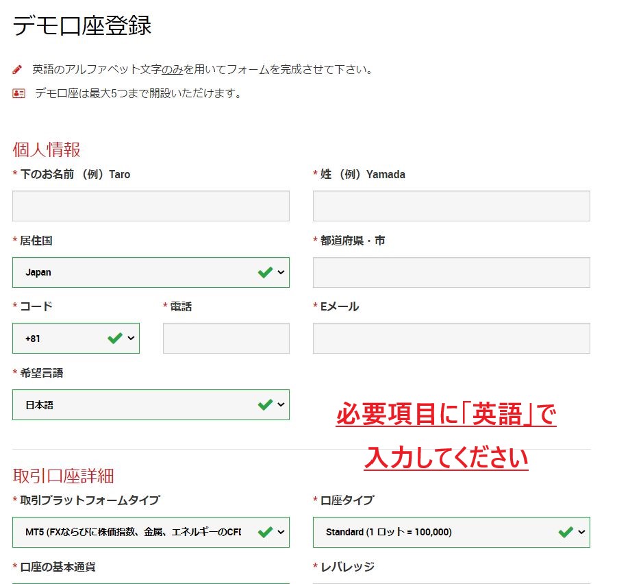 「デモ口座開設」ボタンをクリックすると、デモ口座登録フォームに移動します。