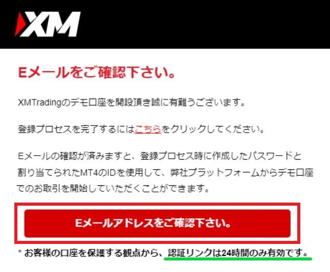 「Eメールアドレスをご確認下さい。」ボタンをクリックしないと、デモ口座が開設されません。ボタンの有効期限はメールが届いてから24時間以内なのでご注意ください。