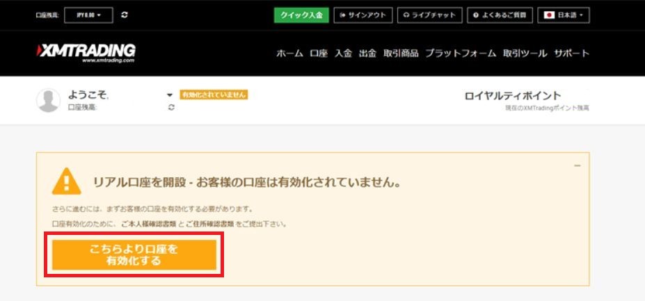 XMで取引口座を開設しても、口座有効化を済ませないとMT4/MT5のプラットフォームにログインする事ができません。XMの会員ページにはログインできるので、マイページから「口座有効化」をするようにしましょう。